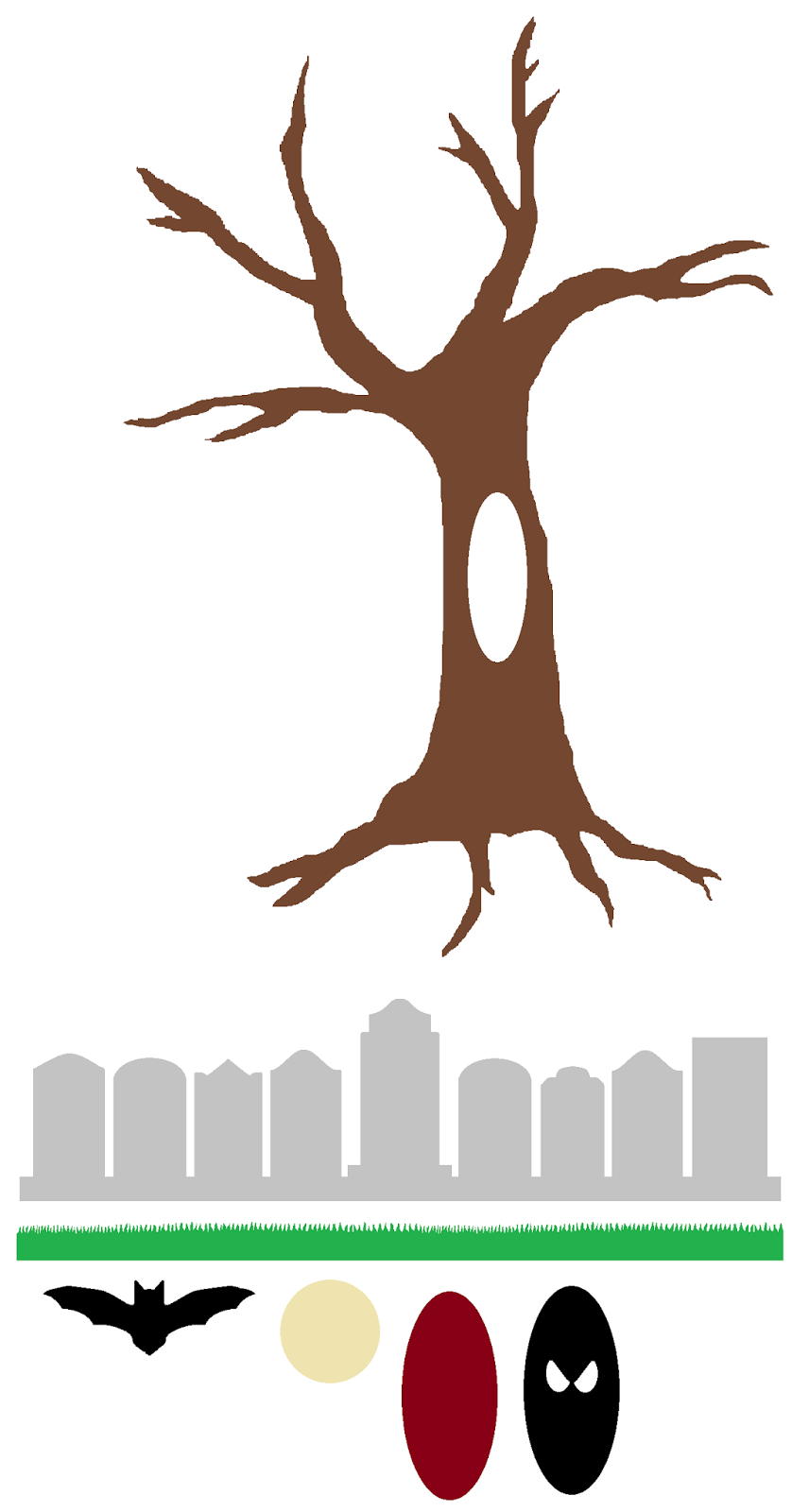 *Write out the party info on the tombstones, if it will fit. Alternately, you could use a white or silver gel pen to write the info off to the side of the tree after you've settled your design.*Taking a piece of dark blue cardstock cropped to the appropriate size, align the various pieces of the invite in accordance with the invite photo at the top of the page. I left the roots on the tree in case you wanted to use the template for other projects, but for this you'll have to trim them a bit to get the tree to fit properly in the design.
